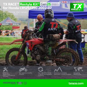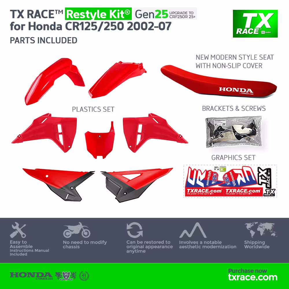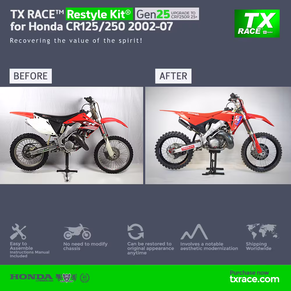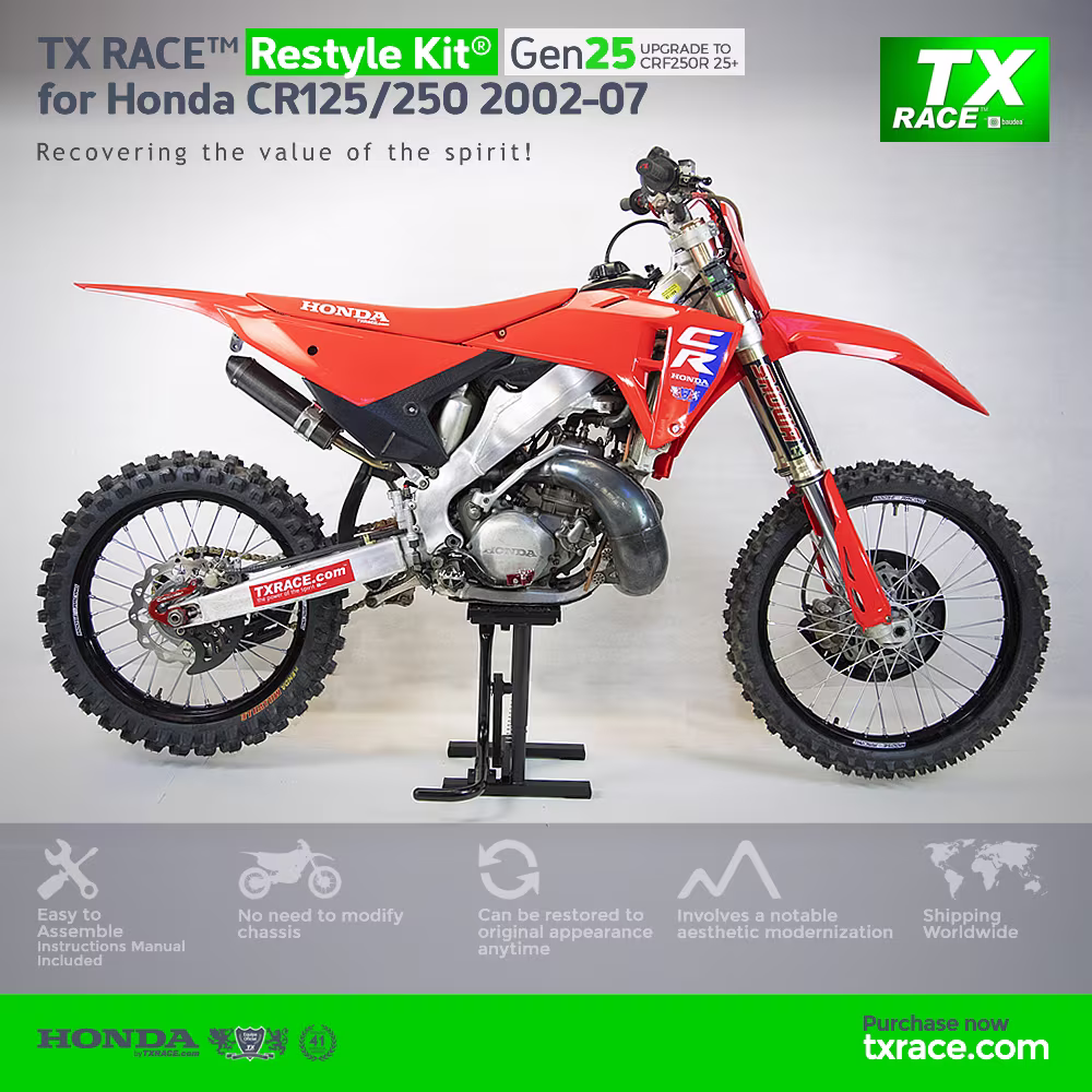 TX RACE™ Restyle Kit® Gen25 for Honda CR125/250 2002 2003 2004 2005 2006 2007 is an update and modernization of the aesthetic line of this Honda two-stroke motocross model [CR].